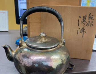 純銀でできた珍しいヤカンです。箱付きで完備されていたので銀の相場より高価買取ができました。 |
