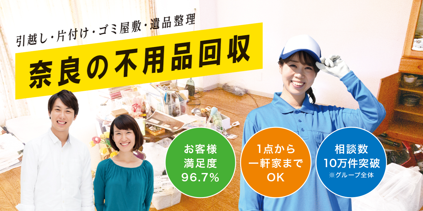 不用品回収ポケット奈良では、奈良県内のみの営業活動としております。奈良県内だけを回収に回っているため、最短即日に廃品回収・粗大ゴミ処分・引っ越しゴミ処分などにお伺いすることが可能です。また、効率よく周回することができるため、高速料金やガソリン代、人件費を抑えることができるのでその分をお客様に還元することが可能です。